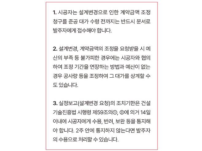 발주자와 시공자 입장에서 서로 말 못 할 부분이 있음을 이해한다면 분쟁이 발생하기 전 예방적 차원에서 좋은 대안이 되지 않을까 싶습니다.