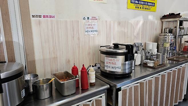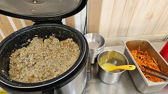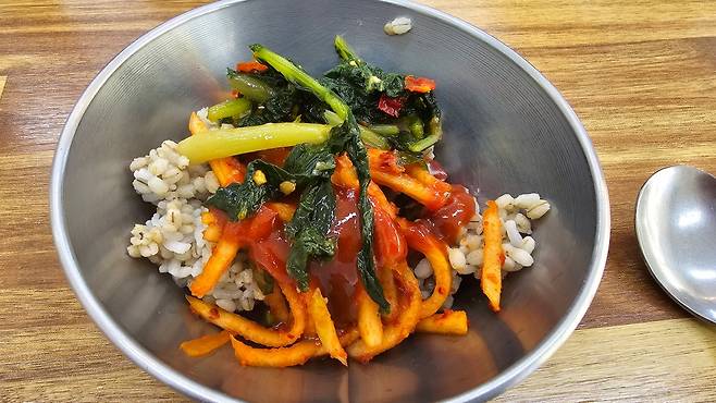 메뉴판에는 ‘모든 메뉴는 보리밥과 스프가 포함’이라고 적혀 있다. 보리밥과 스프는 누구나 먹을 수 있다는 얘기다. 우선 주문한 식사가 나오기 전에 보리밥을 먹어보기로 했다. 보리밥에 무생채와 열무를 얹고 비볐다. 참기름도 한 바퀴 둘렀다. 오랜만에 먹어보는 보리밥, 꿀맛이다. 스프는 흔하게 먹는 크림스프다.