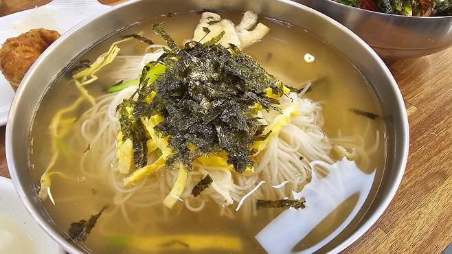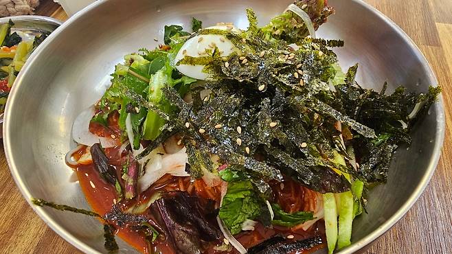비빔국수는 상추와 양파, 오이, 김가루, 삶은 계란 반쪽이 올려져 있다. 쓱쓱 비벼서 한 입 머금고 씹어보니 새콤한 소스가 입안 가득이다. 매콤한 양념장이 쫄깃한 면발과 잘 어우러진다.