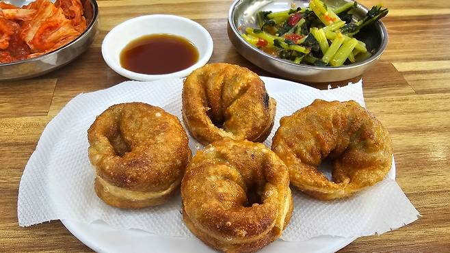 보리밥을 먹자마자 세트 메뉴에 포함된 튀김만두 4알이 나왔다. 노릇노릇하게 잘 튀겨졌다. 아삭~! 겉바속촉이다. 겉에는 바삭한데 만두 속에 육즙이 가득이다. 이 집의 별미다. 꼭 튀김만두를 같이 먹는 걸 추천한다.