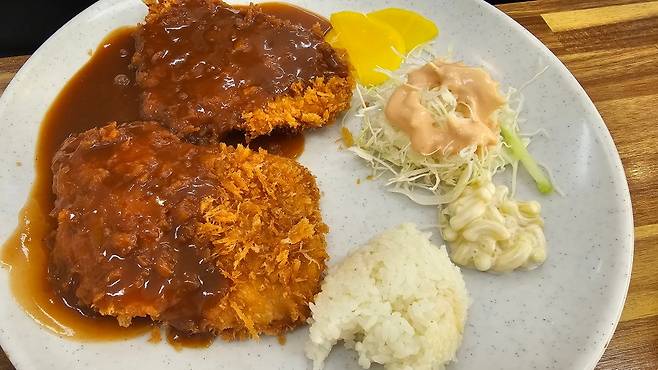 곧바로 나온 돈까스. 얇지 않고 두툼한 국내산 생등심으로 직접 만들었다는 살코기 돈까스 두 덩어리다. 어릴 적 먹던 그 맛이다. 순삭이다.