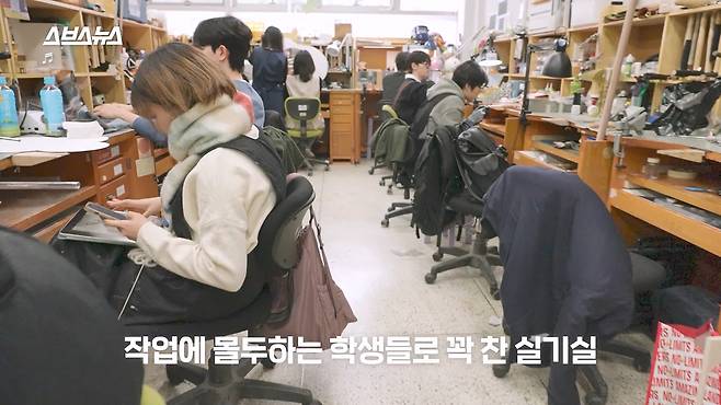 작업에 몰두하는 학생들로 꽉 찬 실기실