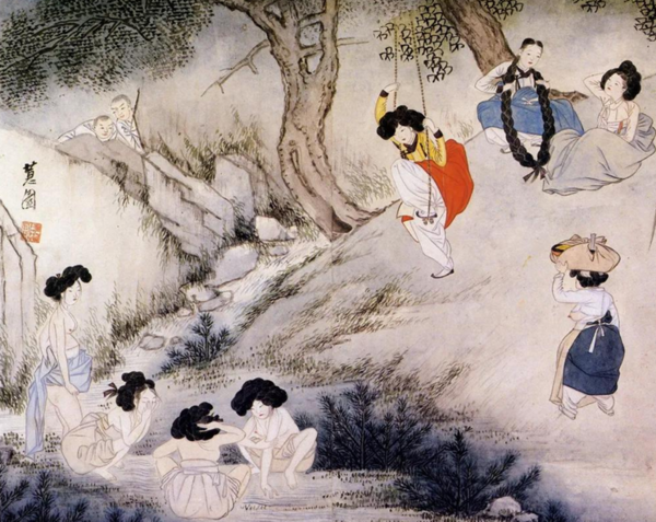 신윤복은 ‘욕망에서 자유로워야 할 스님’이 여인을 몰래 훔쳐보는 장면을 통해,종교적 위선을 해학적이고 은근히 비꼬는 방식으로 묘사했다. 때문에 이 장면은 보는 이로 하여금 슬쩍 미소를 짓게 만든다. 신윤복은 이처럼 일상의 작은 순간을 포착해 감추어진 욕망과 호기심을 익살스럽게 표현했다.