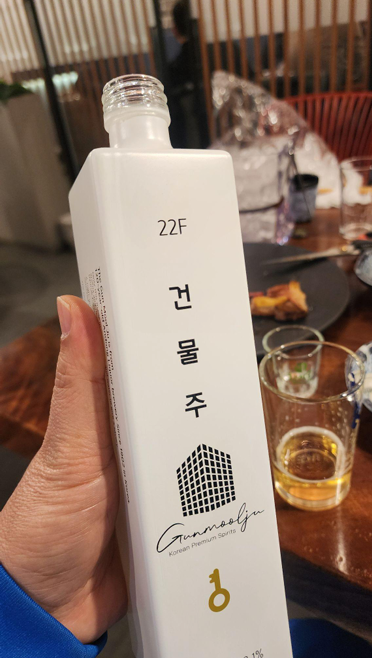 술병에는 22F 건-물-주 라고 써있다. 서민이 꿈꿔오는 그 건물주와 동일한 이름이였지만, 마지막 "주"는 아마도 "主"가 아닌 "酒"였으리라. 그러고 보니 병의 디자인은 빌딩처럼 직사각형이고 라벨 디자인 역시 빌딩이 새겨져 있었다. 22F는 술의 도수. 만든이의 유쾌한 발상에 웃음이 지어졌고, 그덕에 술자리가 내내 즐겁고 웃음꽃이 피었다.