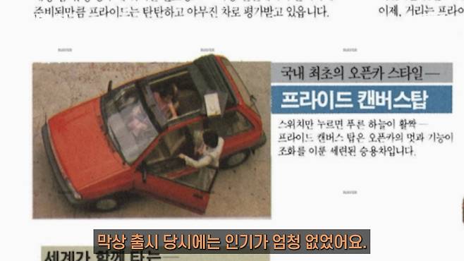 현재에 와서는 극소수 리스토어된 프라이드 소프트탑 모델이 목격되면 온갖 자동차 커뮤니티에서 화제가 되고 있지만, 당시로서는 이 차를 사서 집에 들어간 남편의 등짝이 불꽃 스매싱이 작렬하는 화재현장이 되었을 겁니다.