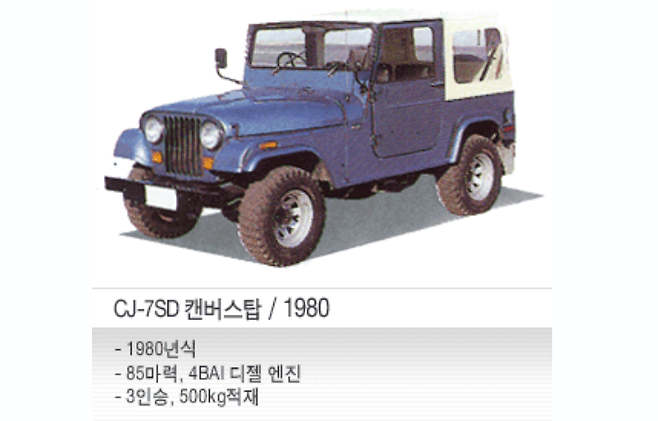 최초의 국산 오픈카(의 정의에 부합하는 자동차)! 1980년 출시한 3기 신진 디젤 지프, 훗날 쌍용의 '코란도' 소프트탑 모델입니다. '3기'라는 점에서 눈치채실 분이 계실지 모르겠지만, 이 차량은 신진이 라이센스 생산하던 미국 AMC사의 '지프'의 '3세대' 모델이었습니다. 문제는 1세대, 2세대 신진 지프는 '소프트탑'을 사용해 '지붕을 열고 닫히는' 컨버터블 자동차의 요건은 충족했지만, 부품 하나하나를 AMC가 지정하는 부품을 사용해야 하는 말 그대로 '라이센스 복제품'이었고 국산화율이 낮아 '국산차(국산화율 60% 이상)'라는 조건을 만족시키지 못했습니다.