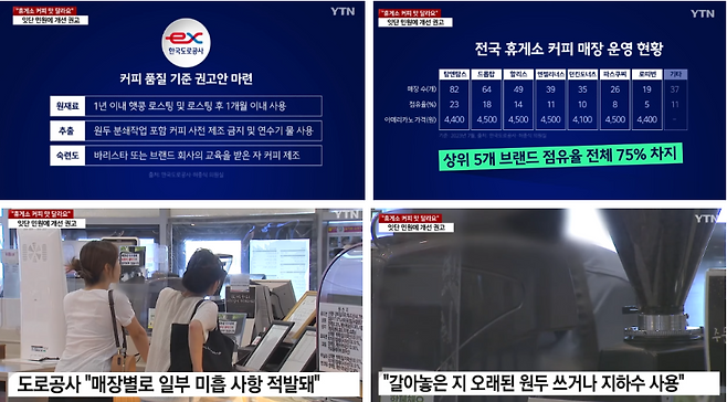 하지만 입점 업체 관리는 개별 휴게소 운영사 소관이라 공사가 개입하긴 어렵다고 설명했습니다. 다만, 휴게소 커피가 일반 매장과 같은 품질을 유지할 수 있도록 권고안을 내렸다고 밝혔습니다.