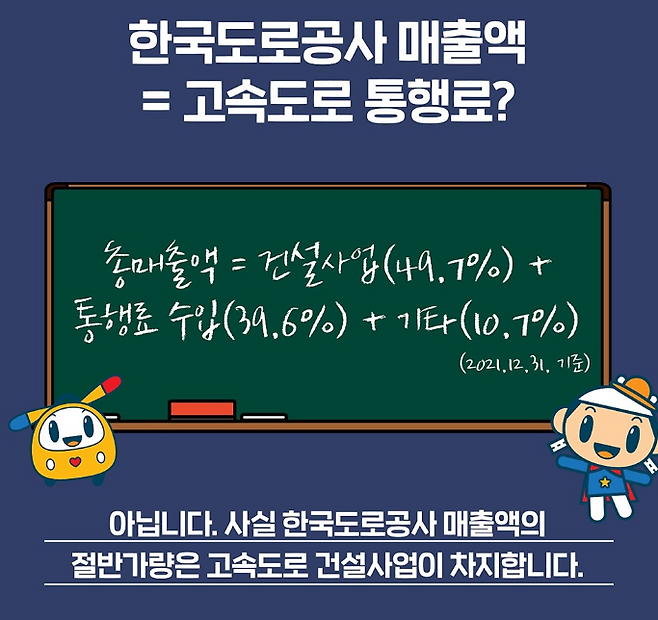 한국도로공사는 직원 수 8700명, 자산 69조 원, 연 매출 9조 5000억 원, 순이익 274억 원에 달하는 매머드 공기업입니다. 이렇게 큰 외형에 비해 매년 순이익이300~500억대에 불과합니다. 물론 공기업이 많은 이익을 내는 게 비정상이지만 결과적으로 도공은 자체적으로 쓸 돈이 거의 없습니다.