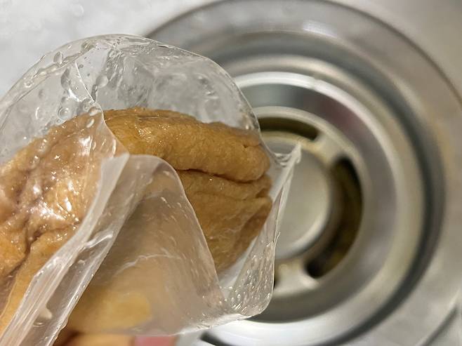 요즘 마트에 가면 유부초밥용 유부 말고 김밥처럼 싸 먹을 수 있는 유부를 판매하고 있습니다. 유부는 국물을 따라 내고 수분도 70% 정도 짜서 준비합니다.