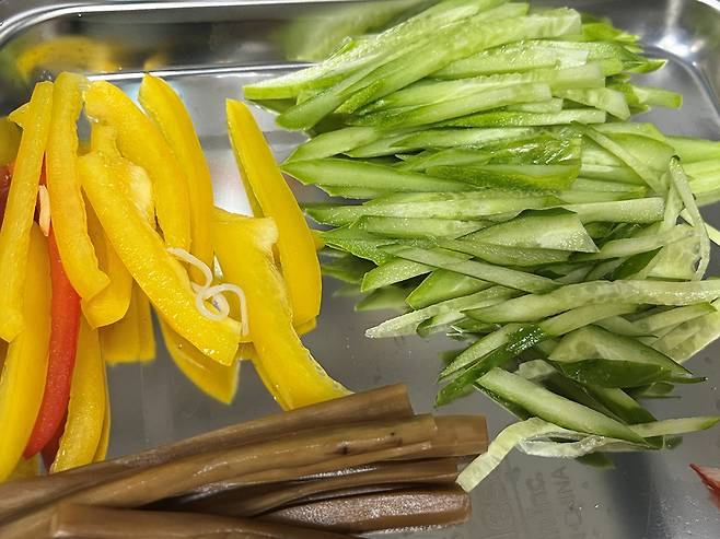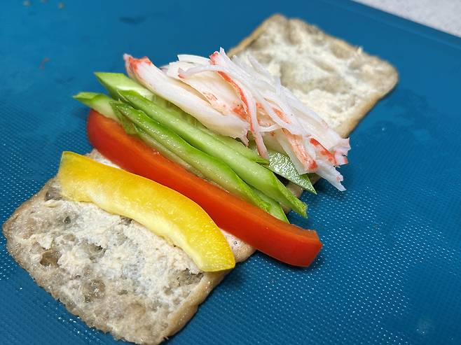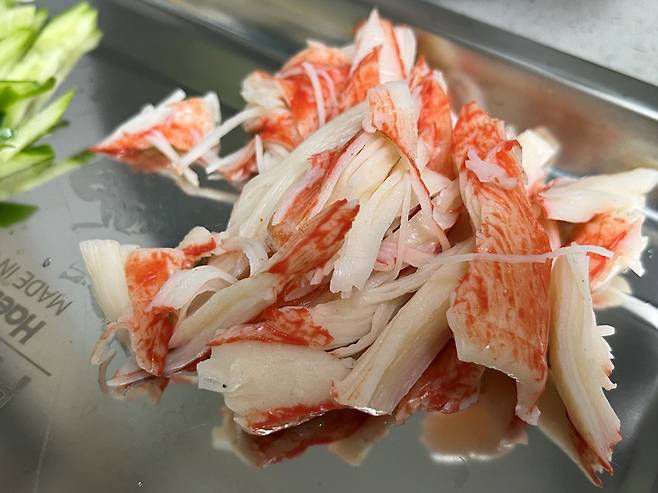 크래미는 짭짤하고 식감도 부드러워 야채와 함께 어울려 먹기에 정말 좋은 재료입니다. 게다가 칼로리도 낮아 부담 없이 드실 수 있어요. 크래미도 찢어서 준비하세요.