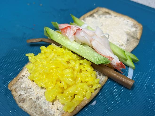 유부쌈을 펼친 다음 야채와 재료를 사진과 같이 가지런히 놓아줍니다. 처음에 야채를 손질할 때 유부쌈의 폭보다 조금 더 길게 손질하면 쌈 싸기도 편해요.
