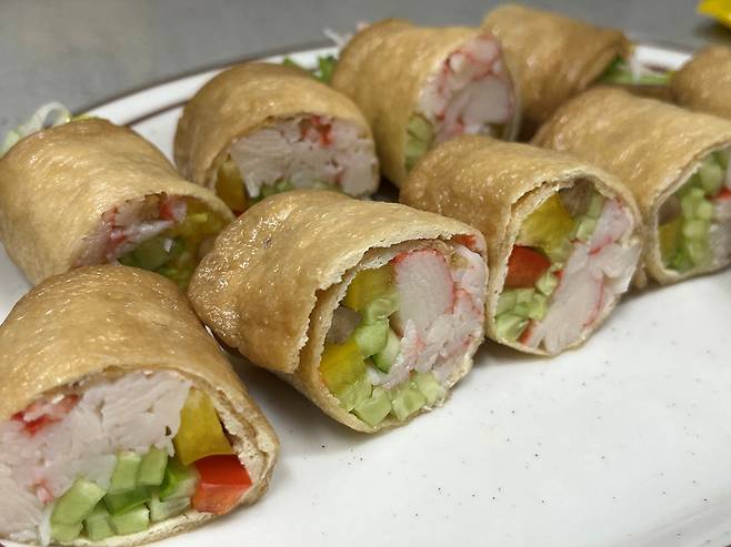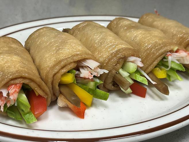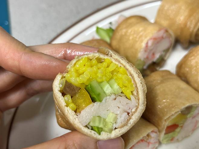 야채가 많이 들어가 건강하고 부담 없는 유부 야채 말이, 야채 싫어하는 분들도 부담 없이 먹기 좋습니다. 냉장고 자투리 재료로 한 번 만들어 보세요!
