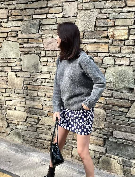 굽이 높지 않은 단화를 매치. 룩이 올드해지지 않도록 하는 꿀팁이죠.