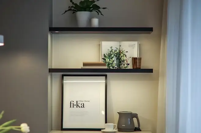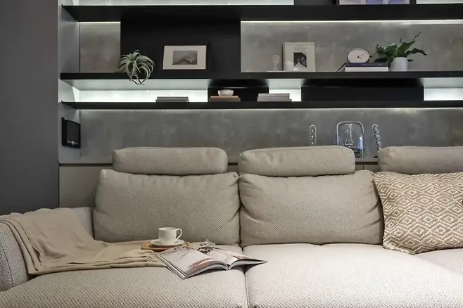 소파 뒤쪽 벽에는 다양한 컬렉션과 사진이 전시된 비대칭 조명의 아트월이 자리한다. 양옆의 키 큰 수납장 사이에 놓인 검은 선반은 시선을 수평으로 유도해 공간감을 확장하며, 거실의 무게 중심을 시각적으로 낮춰준다.