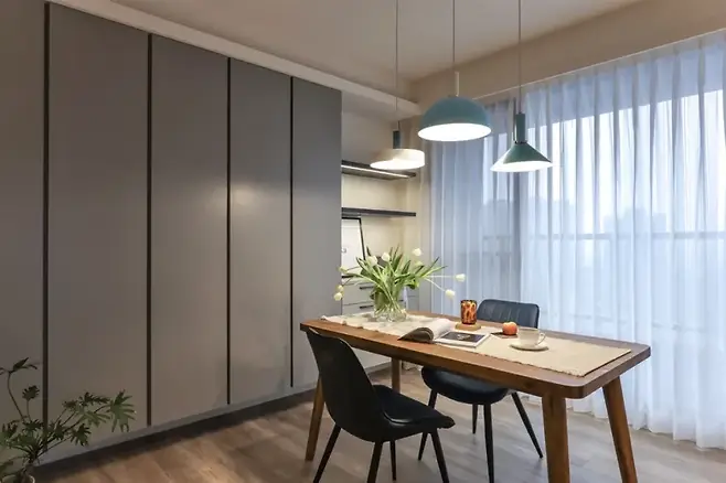 식탁 공간에는 대담한 포인트 컬러의 조명이 드라마틱하게 걸려 있다. 아침 햇살 아래 여유롭게 커피를 즐기기에 이상적이며, 밤에는 세 명 이상의 친구를 불러 모일 수 있는 충분한 공간을 제공한다.