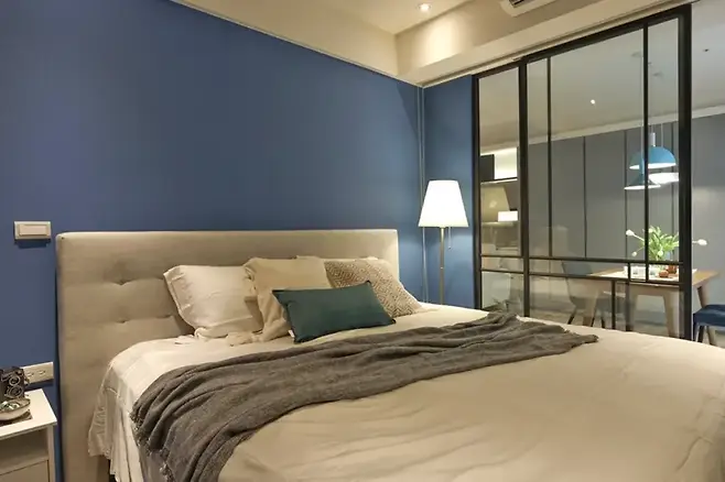 딥 블루 그레이 컬러를 중심으로 침실의 색감을 잡고, 다른 기능은 과감히 배제해 오롯이 휴식에 집중할 수 있도록 설계된 점이 눈길을 끈다.