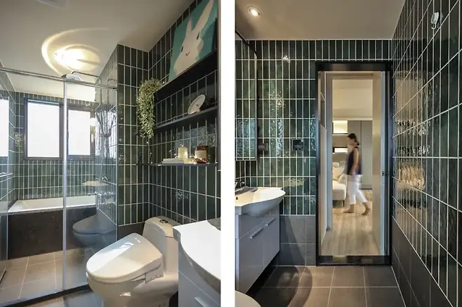 욕실은 공간과 감각의 종착지다. 에메랄드빛의 깊은 타일이 주는 시각적 안정감은, 하루를 마무리하는 사용자에게 잔잔한 위로를 건넨다.