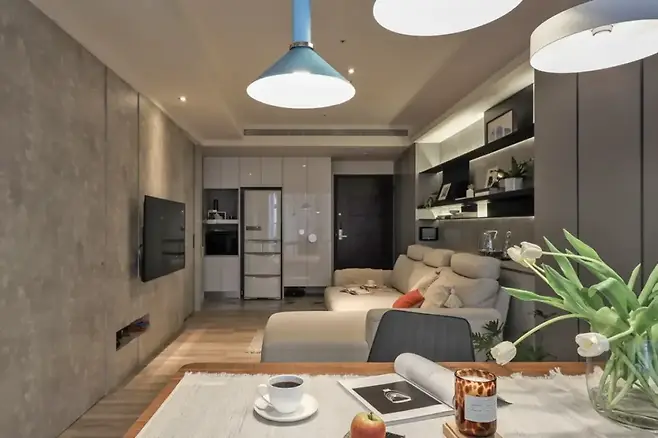거실은 기존 벽체를 철거하고 열림감을 강조했다. 회색 메탈릭 텍스처의 패널은 공간 전체에 일관된 톤을 부여하며, 생활에 부담 없는 마감재 덕분에 관리가 쉽다.