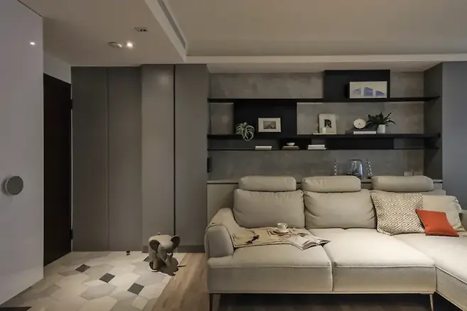 소파 뒤쪽 벽에는 다양한 컬렉션과 사진이 전시된 비대칭 조명의 아트월이 자리한다. 양옆의 키 큰 수납장 사이에 놓인 검은 선반은 시선을 수평으로 유도해 공간감을 확장하며, 거실의 무게 중심을 시각적으로 낮춰준다.