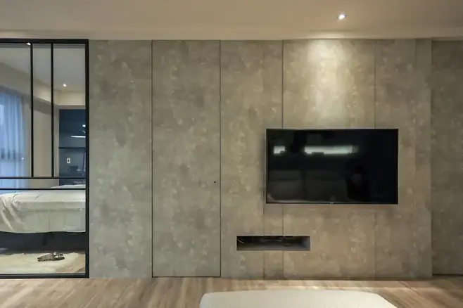 거실은 기존 벽체를 철거하고 열림감을 강조했다. 회색 메탈릭 텍스처의 패널은 공간 전체에 일관된 톤을 부여하며, 생활에 부담 없는 마감재 덕분에 관리가 쉽다.