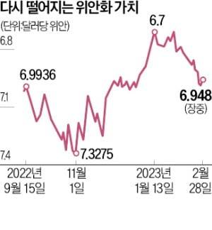 이후 11월 1일 7.3275위안의 고점을 찍은 뒤 리오프닝(경제활동 재개)을 계기로 지난달까지 석 달 연속 하락했다. 그러나 미국의 중국 정찰풍선 격추, 코로나19 중국 기원 주장 재개 등으로 양국 갈등이 다시 고조되자 2월 들어선 3% 가까이 상승했다. 경기 회복이 기대에 미치지 못하고 있다는 분석도 환율 상승 요인으로 꼽힌다. 위안화 환율이 7위안을 넘으면 작년 12월 2일 이후 처음이 된다.