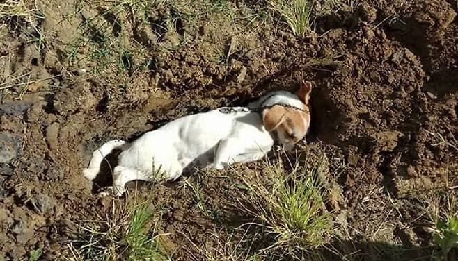 주인님께서는 눈을 감은 사랑하는 반려견을 집 앞마당에 묻어주며, 영원한 안식을 기원하는 슬픈 애도를 표하셨습니다.