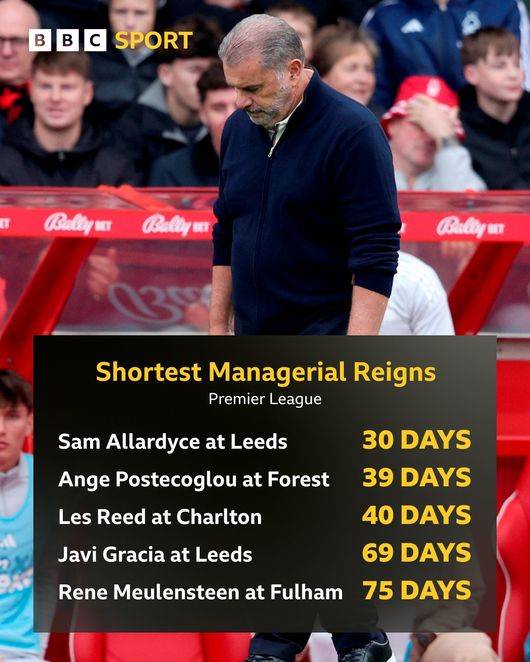이로써 4연패에 빠진 노팅엄은 1승 2무 5패, 승점 5로 강등권인 18위까지 떨어졌다. 그러자 노팅엄 구단도 경기가 끝난 지 19분 만에 포스테코글루 감독 경질을 발표하는 결단을 내렸다. 에반겔로스 마리나키스 구단주가 종료 휘슬이 불리기도 전에 분노한 표정으로 자리를 뜨더니 그대로 공식 발표로 이어졌다.