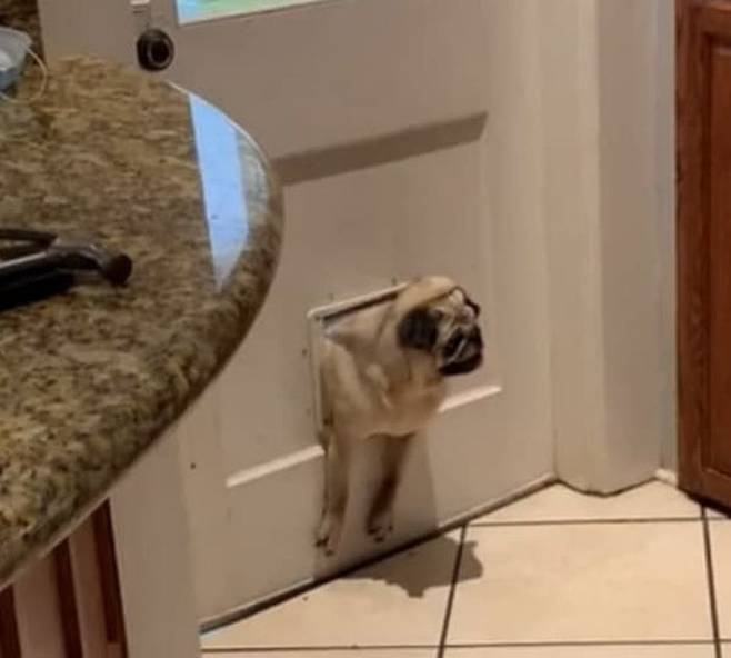 공개된 사진을 보면 강아지는 고양이를 위해 만들어놓은 전용 출입문에 몸이 끼어서 아무것도 못하고 있는 모습이었습니다.