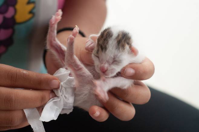 이때, 집사가 엄마 고양이의 역할을 대신해 새끼 고양이의 생식기 부분에 물티슈나 거즈로 톡톡 두드려 주면 됩니다.