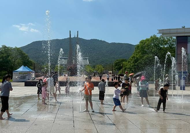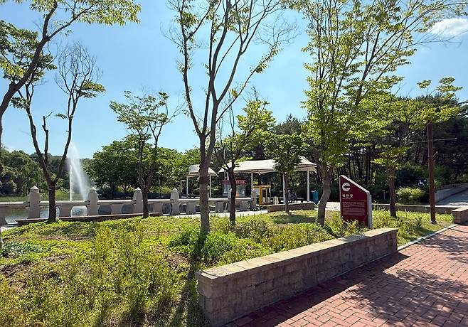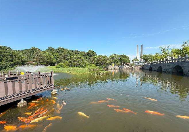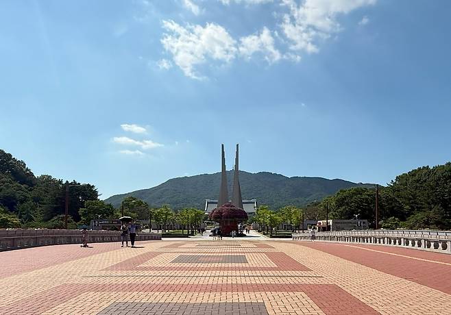 두 번째 다리인 독립의 다리는 겨레의 집으로 가는 길목에 자리 잡고 있으며 무궁화 문양의 보도블록이 깔린 다리입니다. 멀리 흑성산 아래 겨레의 집이 한눈에 들어옵니다.