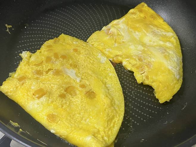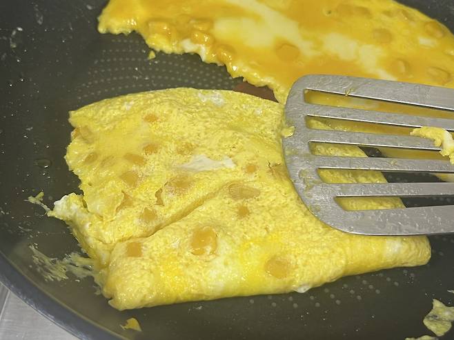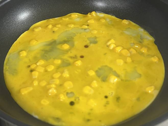 옥수수콘 1스푼을 넣고 함께 섞어서 계란을 풀어 주세요. 옥수수콘을 계란에 넣으면 은은한 단맛이 계란의 고소함과 어우러져 훨씬 맛있어집니다. 또한 식감이 톡톡 씹혀 먹는 재미가 있습니다.