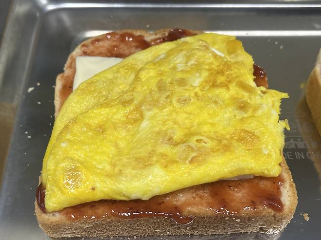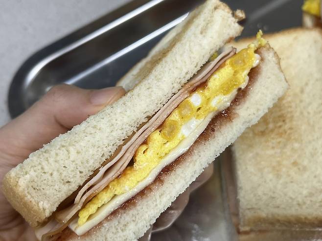 계란은 적당한 크기로 잘라서 접어서 준비합니다. 이렇게 하면 빵 사이에 끼워 넣기 훨씬 수월하고, 먹는 동안 재료가 흘러내리지 않아 깔끔합니다.