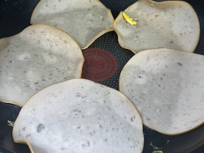계란과 함께 곁들일 닭가슴살 햄을 굽습니다. 일반 햄보다 닭가슴살 햄을 선택하면 지방과 포화지방 함량이 낮아 아침에 부담이 적고 혈당 관리에도 도움됩니다. 또한 기름기가 적어 부담이 덜 하고요.