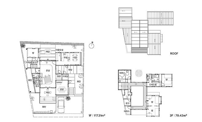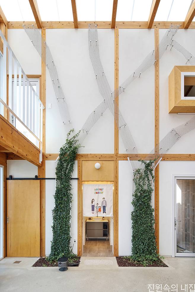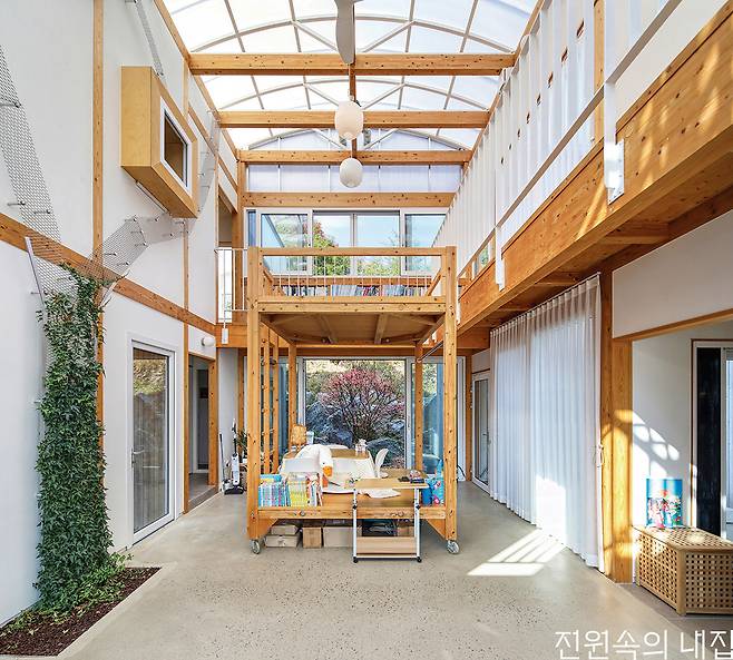 공간으로서의 온실은 폴리카보네이트 벽체와 지붕으로 덮인 실내면서도, 신발을 신고 다니는 공간이다. 온실은 가족이 모이는 공간이면서도 가족들 개인 공간을 분리한다. 집은 중앙의 온실을 중심으로 1층에는 주방과 식당, 게스트룸과 공방이, 2층에는 안방과 아이 방이 놓였다. 그렇다고 집은 온실을 향해서만 열린 폐쇄적인 중정 주택과는 다르다. 온실을 통해서 각 채에 접근할 수 있으나, 외부에서도 각각의 채로 접근할 수 있는 다양한 출입구를 가졌다.