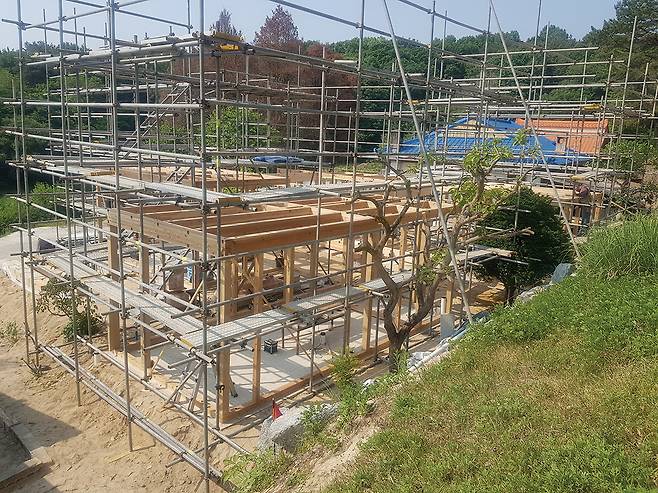 구조 : 기초 - 철근콘크리트 매트 + 줄기초 / 지상 –중목구조(지붕 : 중목 보 + 2×10 구조목)