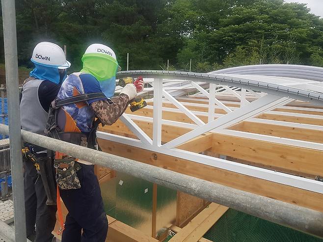 외부마감재 : 외벽 – 유절 삼나무 사이딩 위 규화제 도장, 복층 폴리카보네이트, 노출콘크리트 위 발수제 처리 / 지붕 –컬러강판, 복층 폴리카보네이트(두인폴리캠)