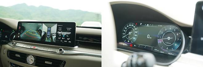 디스플레이는 다소 촌스러운 디자인이었다. 그동안 계기판에서 쭉 이어져 안쪽으로 굽어진 형태를 많이 봐서 그런지 옛날 디스플레이 같았다. 각종 공조 장치는 물리 버튼으로 돼있어 조작하는 맛이 살아 있었다.