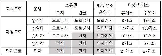 고속도로는 크게 투자 주체에 따라 정부가 투자한 '재정도로'와 민간기업이 투자해서 만든 '민자도로'로 나뉘는데 휴게시설도 마찬가지로 투자를 누가 했는지에 따라 '재정휴게시설'과 '민자휴게시설'로 나뉩니다.