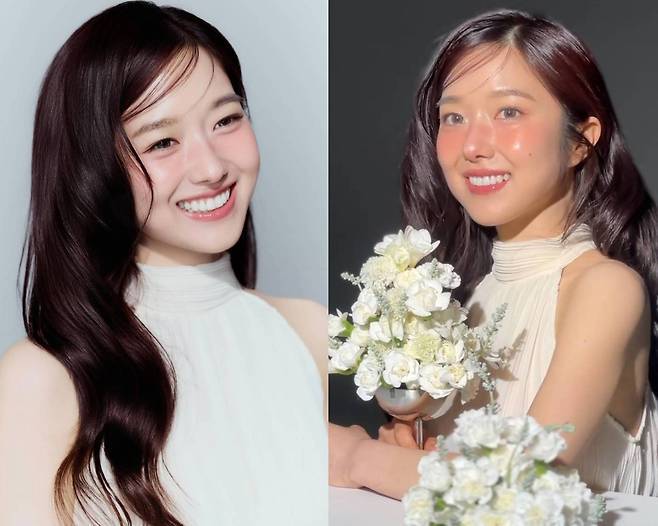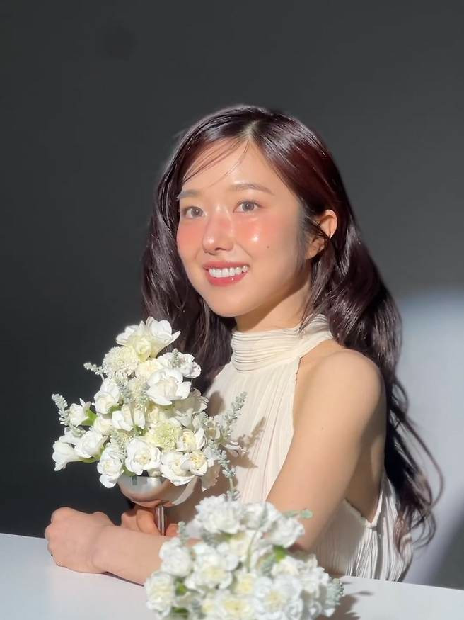 특히 화이트 플라워 부케는 룩에 포인트를 주면서도 전체적인 스타일에 통일감을 부여해, 웨딩 화보로 착각하게 할 만큼 완성도 높은 룩을 완성했습니다.