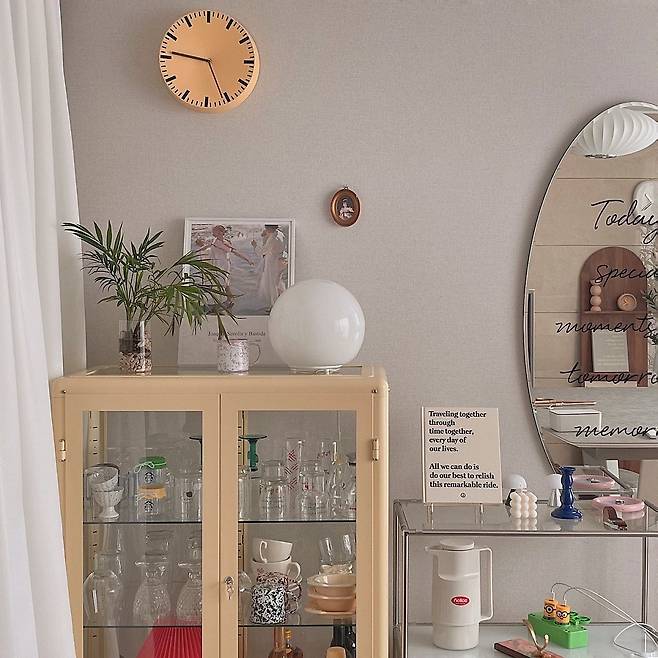 빈티지 조명과 벽난로, 노란 수납장 속 컵 컬렉션까지, 디테일 하나하나가 감각을 밀도 있게 채운다. 플라워 패턴의 커튼에서 풍기는 로맨틱한 결도 이 집만의 특별함이다.