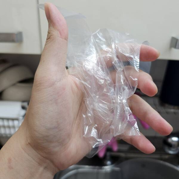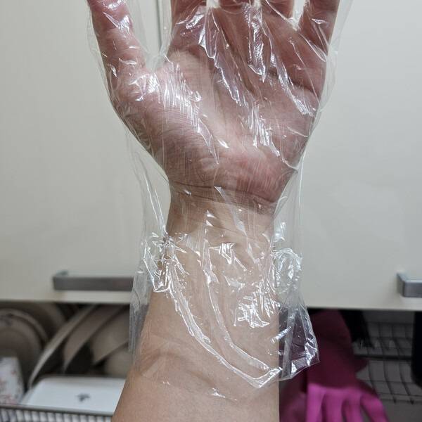 비닐장갑이 크거나 오래돼 늘어졌다면, 손목에 고무줄을 한 바퀴 감아 고정하세요. 고무줄을 너무 세게 묶지 않고 살짝 걸치는 정도로만 하면 손목에 자국이 남지 않으면서 장갑이 빠지지 않습니다. 설거지나 세탁 시에도 물이 전혀 새지 않죠.
