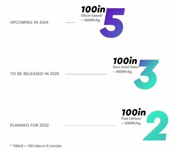 스토어닷은 현재 충전 시작 후 단 5분 만에 160km까지 주행 가능한 배터리를 제조하는 기술을 개발한 데 이어 2024년까지는 5분 내, 2028년까지는 3분 내, 2032년까지는 2분 내에 충전할 수 있는 극한의 에너지밀도솔루션을 개발한다는 목표를 제시하고 있다.