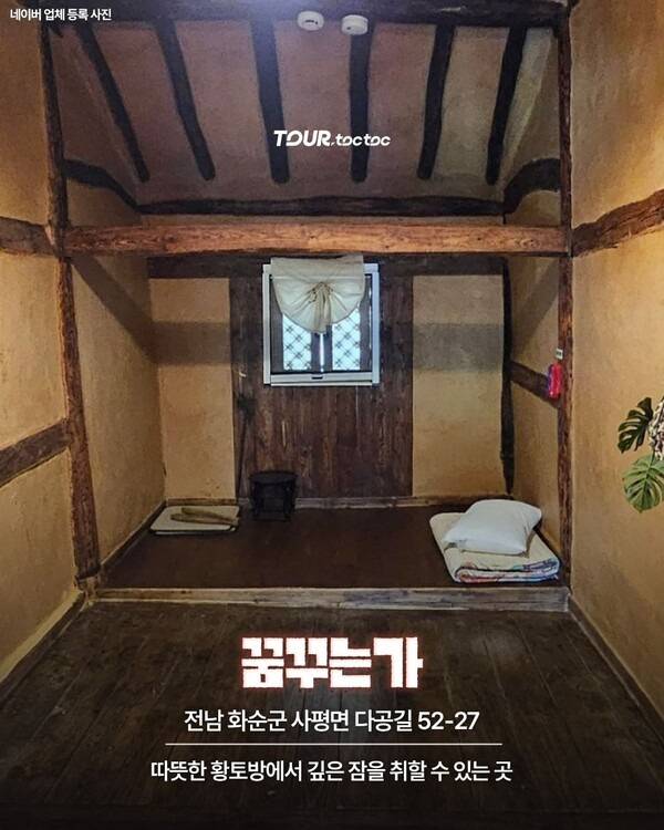 꿈꾸는가는 따뜻한 황토방에서 푹 쉬어갈 수 있는 전남 화순의 촌캉스 숙소입니다. 자연 재료로 지어진 방은 포근함을 더합니다.