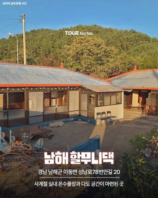 남해 할무니댁은 사계절 내내 이용 가능한 온수풀장이 준비되어 있어 가족 단위 숙소로 인기가 높습니다. 조용한 분위기의 다도 공간도 마련되어 있어 전통문화 체험도 함께 할 수 있는 복합형 촌캉스 숙소입니다.