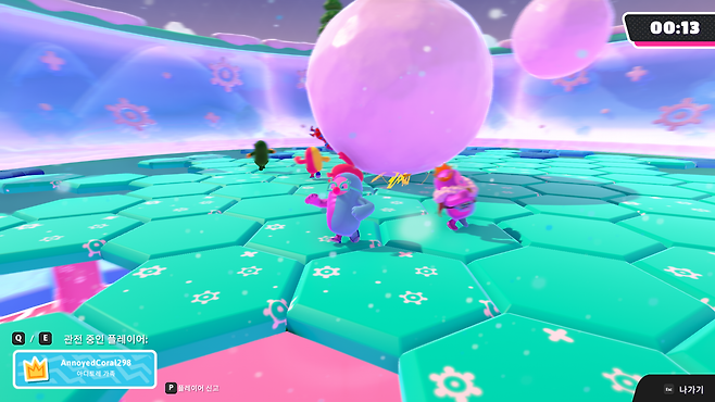 이동, 점프, 다이빙, 잡기 밖에 할 수 없는 폴 가이는 그래서 일반적인 배틀로얄 게임처럼 다른 유저를 제압하고 이기는 방식은 아닙니다. 오롯이 레이스에서 살아남아야 하는 것이 전부죠. 물론 각 캐릭터간 충돌 시스템을 이용해 슬쩍 밀어 떨어뜨리거나 파티 플레이시 폭탄 등을 상대 팀에 던지는 것으로 방해를 할 수 있지만 어쨌든 가장 신경 써야 하는 부분은 “각자도생” 끝까지 버티는 것입니다.