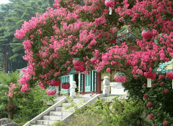 전라남도 화순의 만연사는 산자락에 고요히 자리한 사찰로, 여름마다 사찰 입구부터 절 마당까지 배롱나무가 흐드러지게 피어나는데요. 붉은 꽃과 회색 기와가 어우러진 풍경은 절제된 아름다움을 보여줍니다.