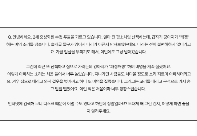 [동물이 건강한 집] 산책하다 갑자기 "깨갱" 비명을 지르는 강아지, 무슨 문제일까요?