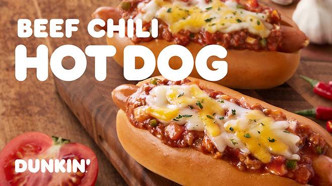 던킨의 ‘비프칠리 핫도그’는 부드러운 소프트 핫도그 번(Bun, 버거용 빵)에 풍성한 육즙을 살린 소시지, 알싸하고 감칠맛이 풍부한 비프칠리소스와 체다치즈를 넣은 미국식 핫도그다. 한입 베어 무는 순간 탱글탱글한 소시지의 식감과 짭조름한 치즈, 매콤한 소스 맛이 조화롭게 어우러져 진한 풍미를 선사한다.