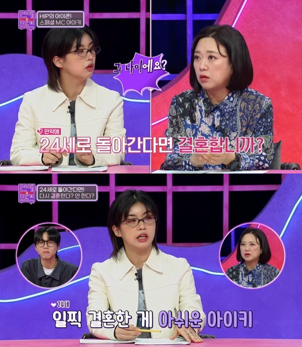 최근 KBS Joy ‘연애의 참견’에 스페셜 MC로 출연한 아이키는 김숙에게 다시 돌아가면 그 나이에 결혼할 것이냐는 질문을 받자 “그 나이로요? 그 사람과요?”라고 되물으며 망설이는 모습을 보였는데요.