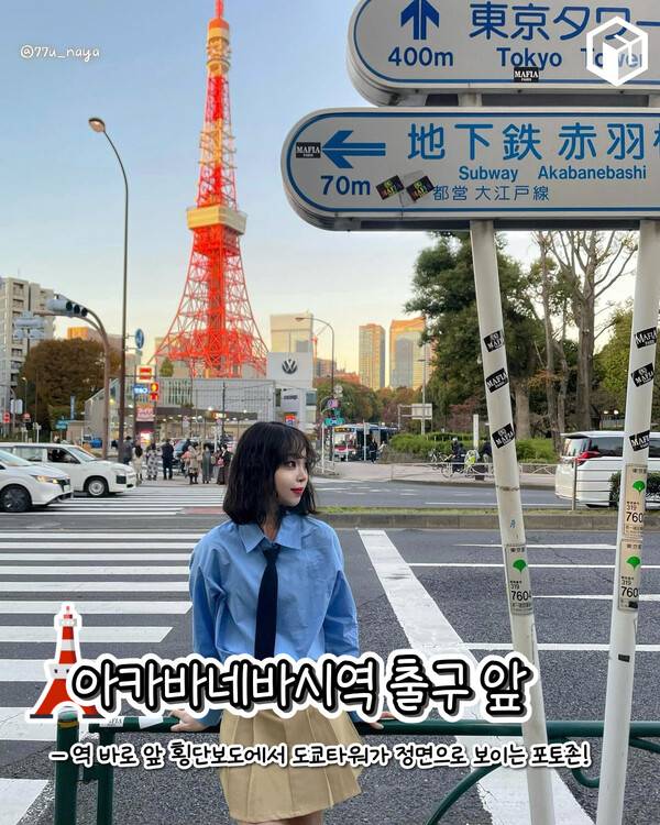 첫 번째로 소개해드릴 포토스팟은 바로 아카바네바시역 출구 앞입니다. 이 곳은 아카바네바시역 바로 앞 횡단보도에서 도쿄타워가 정면으로 보이는 포토존으로 타워를 정면에서 볼 수 있으며 횡단보도와 함께 도쿄의 정취를 한 프레임에 담을 수 있어 추천드리는 도쿄타워 포토존입니다.